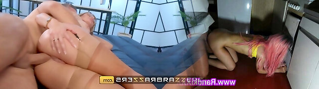 Cumming Inside Busty MILF And Teen Glasses Girl In The Kitchen Blowjob Session