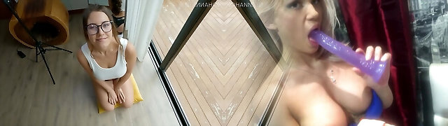 Horny Blonde Babe Fucks Her Own Big Boobs and Glasses!