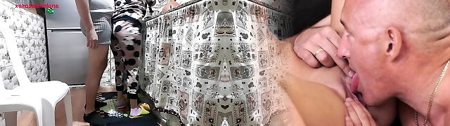 Pussy-licking BBW maid gets fucked while washing dishes in the kitchen!