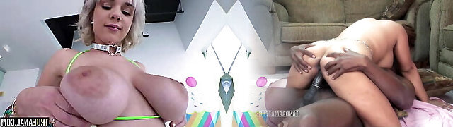 Black and White Porn Beauty Blows Big Load All Over Her Tits