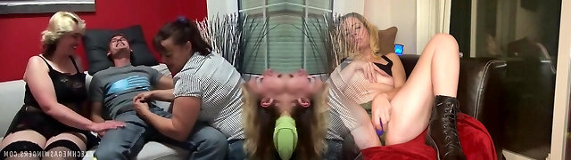 Busty Swinger Girls Get Their Cocks Sucked By a Lucky Dick in This Group Fuck Fest!